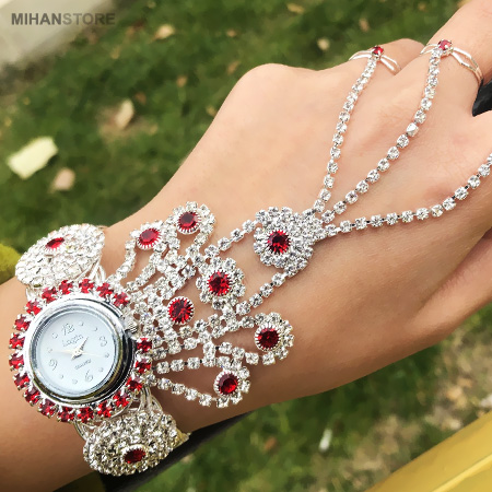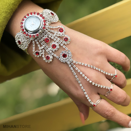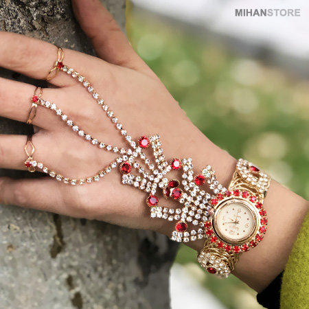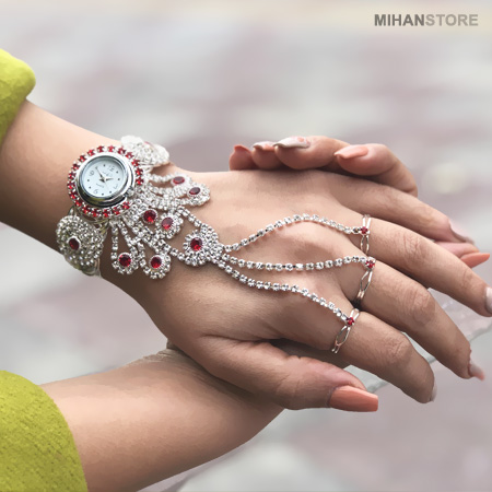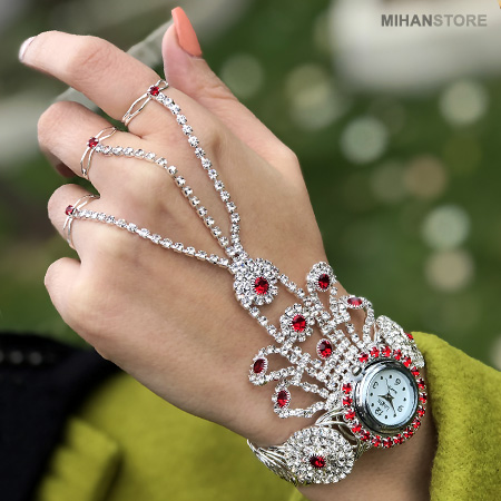 مدل دستبند انگشتری متصل که به آن تمیمه می گویند، یکی از زیورآلات و جواهرات ترکیبی شیک و زیبای مورد علاقه خانم ها است. ساعت دستبندی و انگشتری GEM دستبند با زنجیرهای تزیینی یا ترکیب نگین و زنجیر به 3 انگشتر وصل شده است. ساعت دستبندی و انگشتری GEM قابلیت تنظیم دستبند و انگشتر به هر سایزی را دارد. نگین های این محصول بسیار با کیفیت می باشند و همچنین آبکاری این ساعت فوق العاده با کیفیت و مقاوم است.